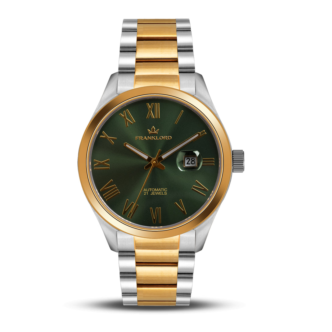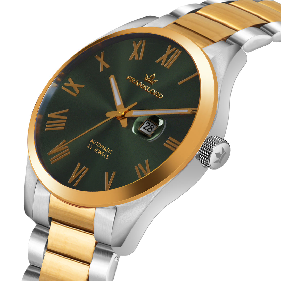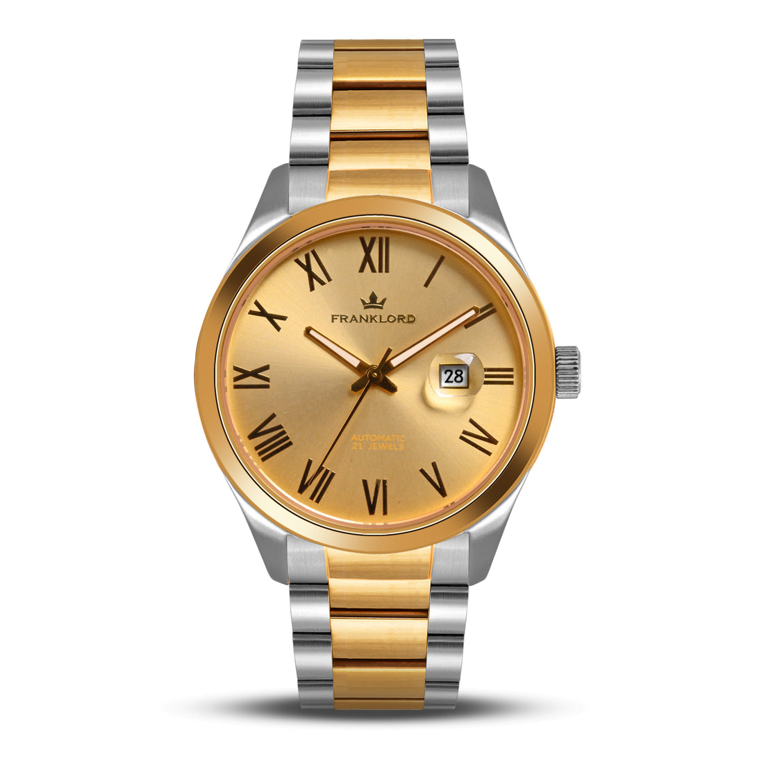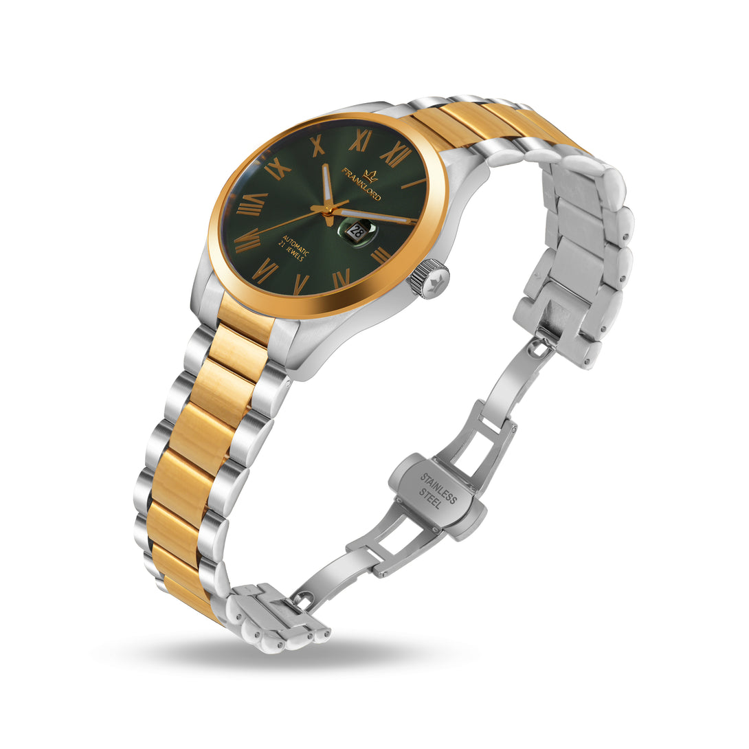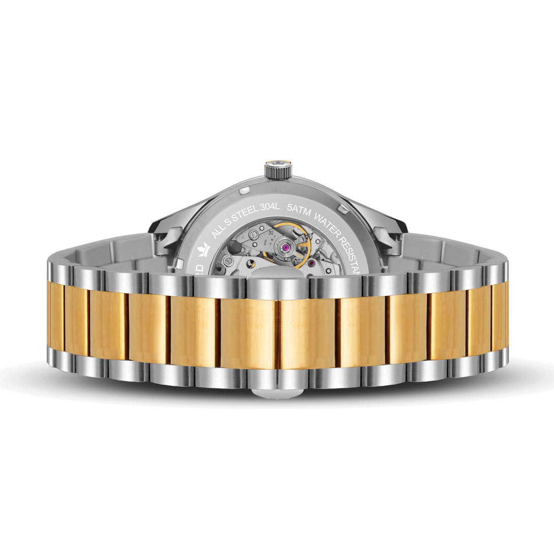 Engineered with a robust 21-jewel automatic movement and shielded by a sapphire crystal, this watch blends luxury and durability. The two-tone stainless steel bracelet, with its gold center links, adds a regal edge, perfect for those who lead with vision and grace.