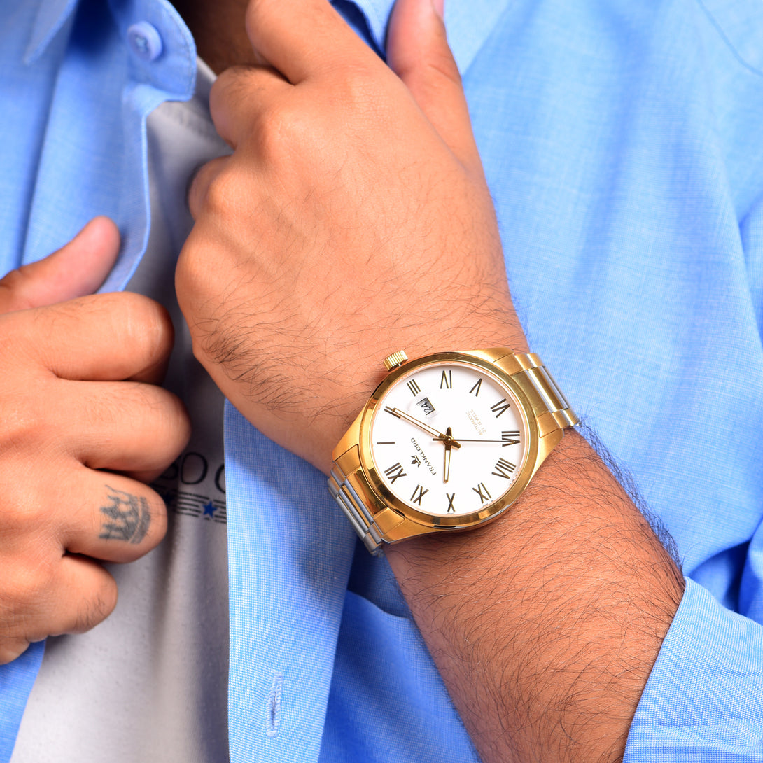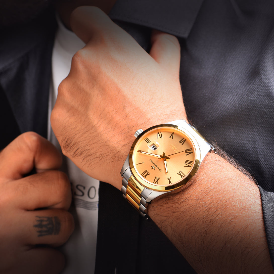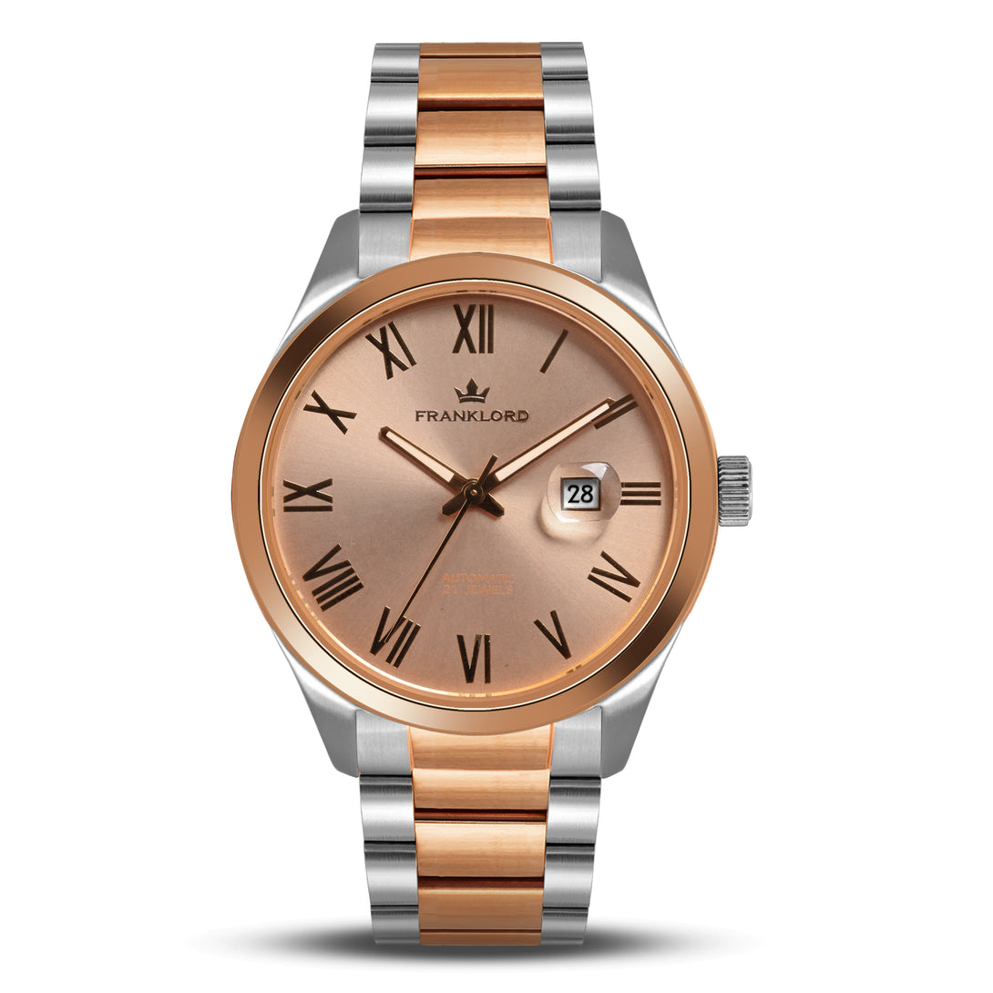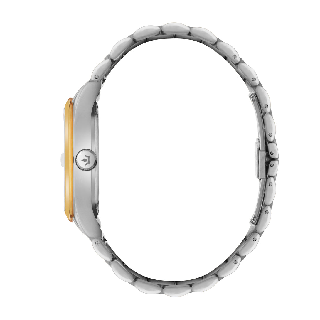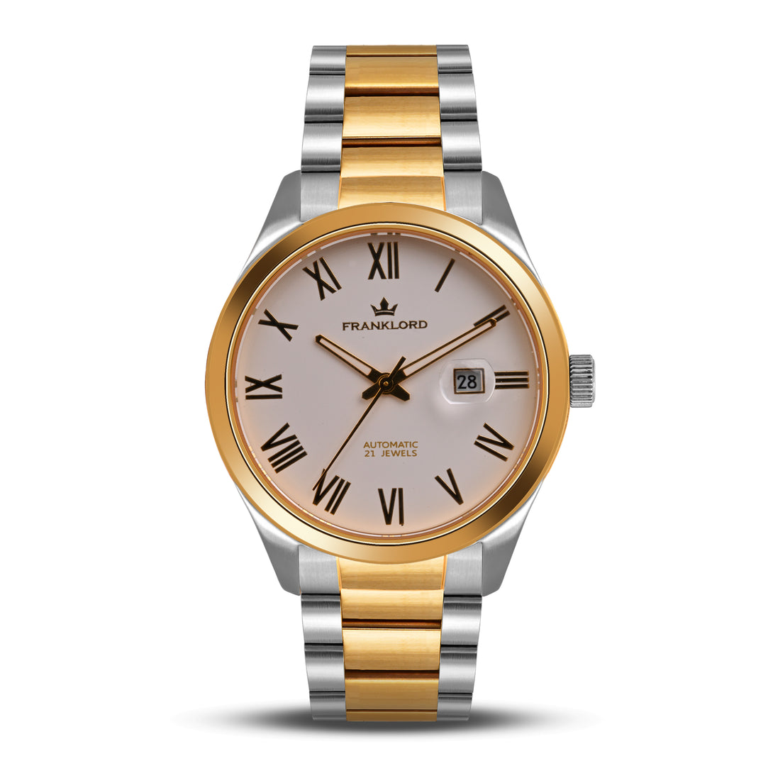 Engineered with a robust 21-jewel automatic movement and shielded by a sapphire crystal, this watch blends luxury and durability. The two-tone stainless steel bracelet, with its gold center links, adds a regal edge, perfect for those who lead with vision and grace.