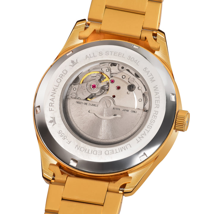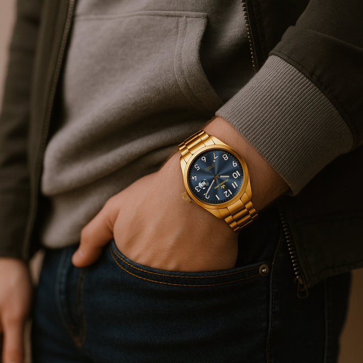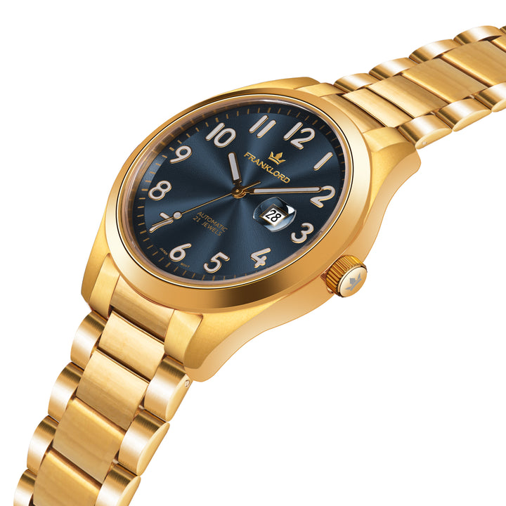 Presenting the 'Blue On Gold' from the esteemed Franklord Regal Sapphire Vanguard collection. This luxury automatic watch combines a deep, sunburst blue dial with an opulent gold-tone finish for a look that is both classic and commanding. It's a sophisticated choice for the gentleman who values timeless style.