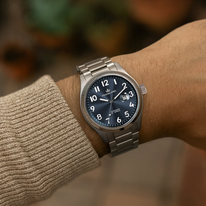 Presenting the 'Blue On Silver' from the esteemed Franklord Regal Sapphire Vanguard collection. This luxury automatic watch offers a sophisticated take on the classic sports watch, featuring a deep blue sunburst dial that adds a touch of color while maintaining a timeless profile. It's the perfect, versatile companion for every part of your day.