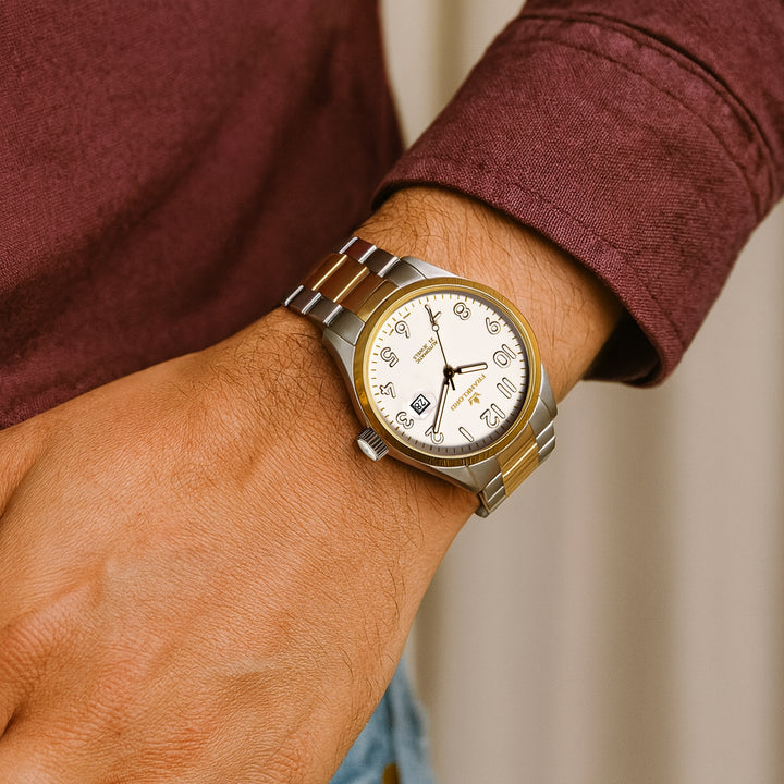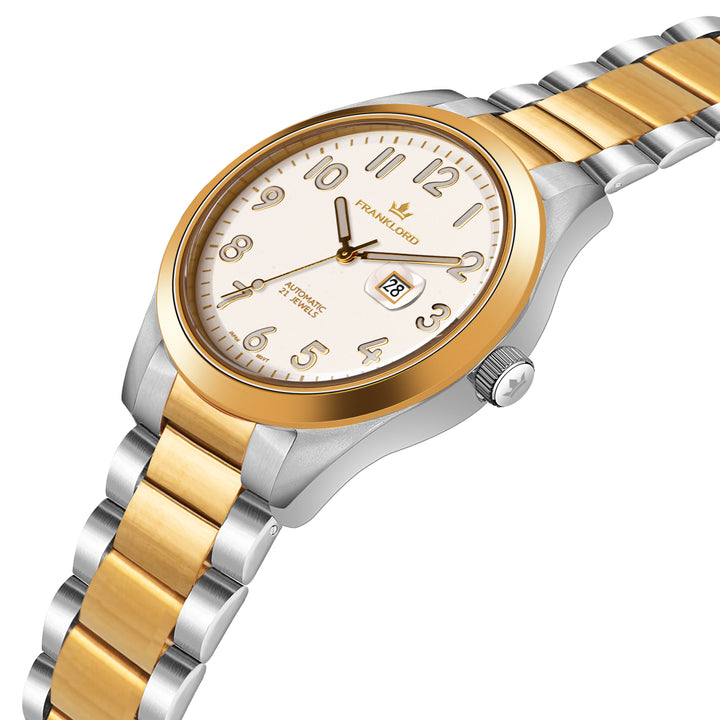 Presenting the 'White On Gold Two Tone' from the esteemed Franklord Regal Sapphire Vanguard collection. This luxury automatic watch is a study in understated elegance, pairing a crisp white dial with the refined warmth of a two-tone steel and gold bracelet. It’s a perfectly balanced and versatile timepiece for the discerning gentleman.