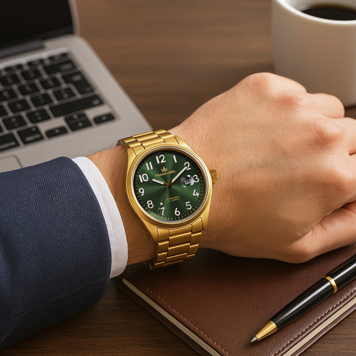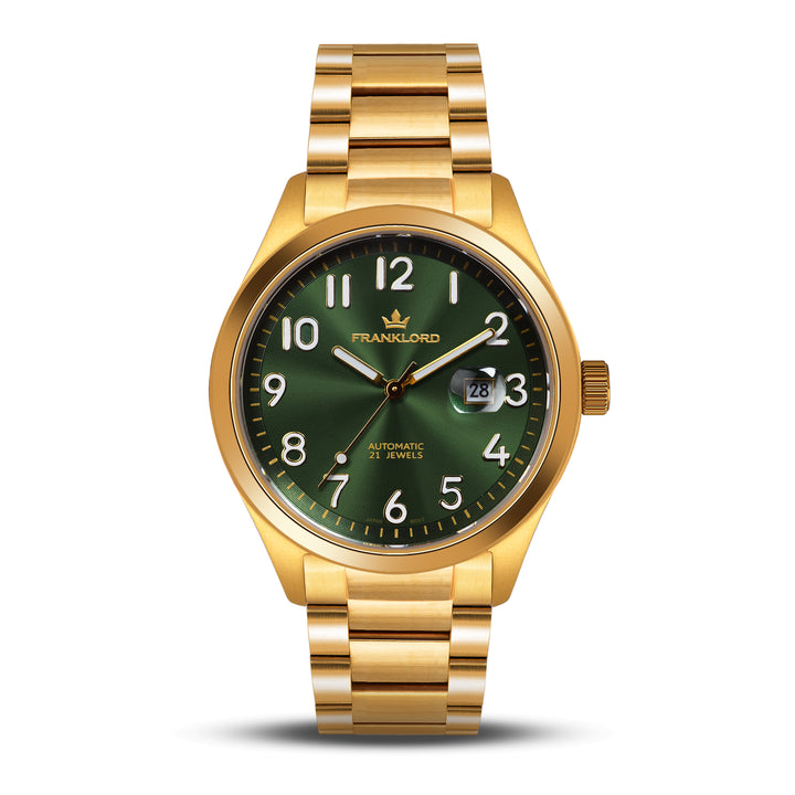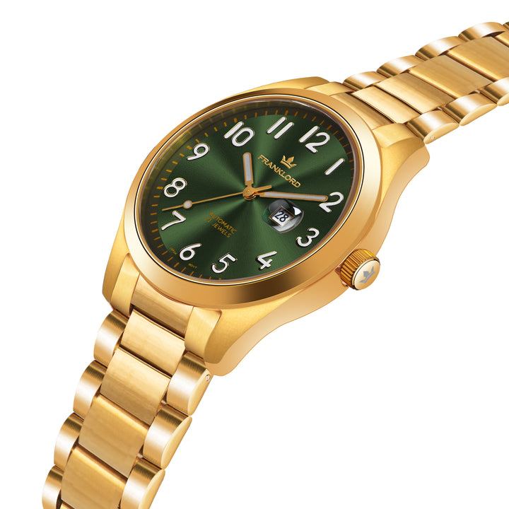 Presenting the 'Green On Gold' from the esteemed Franklord Regal Sapphire Vanguard collection. This luxury automatic watch is a masterpiece of contrast and sophistication, designed for the distinguished gentleman. The rich, sunburst green dial paired with an opulent gold-tone finish creates a timepiece that is both powerful and elegant.